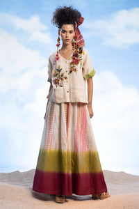 Featuring V-Neck Embroidered Front-Open Jacket Shirt with Lining & Pockets paired with Tie-Dye Flare Pants. Crafted from soft linen and cotton in Ecru and Mehroon, this set features intricate embroidery and a stylish tie-dye design with shaded hems, combining comfort and modern elegance for a chic, elevated look.
