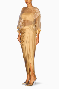 Featuring an organza kaftan adorned with tissue flowers embroidered on the shoulders and bottom, paired with a bandeau top and a dhoti skirt, creates a mesmerizing ensemble that exudes elegance and charm.