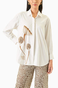 Featuring a White shirt with puffed sleeves and an embroidered pattern on one side. Versatile and chic, this shirt can be worn in multiple ways. Whether styled as a shirt dress, exuding casual sophistication as it grazes your thighs with effortless grace, or worn by itself, paired with your favorite bottoms for a classic yet contemporary look.