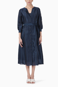 Featuring an embroidered sleeve hand stiched detail dress in silk chanderi.