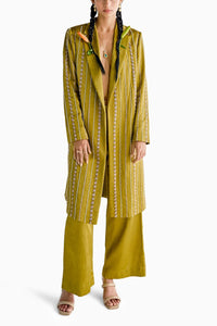 Featuring a lime green embroidered trench coat paired harmoniously with pants in the same vibrant tone. The coat is adorned with intricate embroidery, adding a touch of intricate detail and elegance to the overall look. Its lime green hue brings a refreshing burst of color, perfect for making a statement while maintaining refined style.ÂÂ
