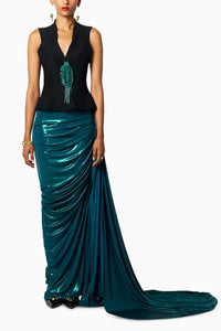 Featuring Eme Jacket With Liquid Emerald Kaai Skirt by 431-88's 9-6 collection, this co-ord set pairs a sleeveless embroidered blazer with a high-slit liquid jersey skirt, offering fluid elegance and statement style for day or evening wear.