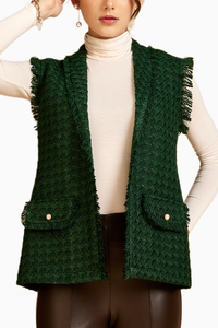 Elevate your style with our exquisite dark green shiny tweed jacket. Featuring a sophisticated shawl collar and fringe detailing, this jacket exudes timeless charm. The fringe extends to the collar and pockets, adding a touch of elegance. The show pockets are adorned with pearls, creating a luxurious finish. With a flattering regular fit, this jacket is a perfect blend of classic and contemporary fashion.
