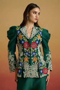 Featuring Emerald Contrast Cordwork Panelled Jacket by Chandrima’s Amaryllis FW25 Collection. An emerald chanderi jacket adorned with contrast cordwork and delicate bead embellishments, featuring panelled construction for a striking blend of artisanal craftsmanship and contemporary style.