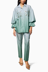 A graceful ombré co-ord set in soothing shades of green, featuring jewel-embellished pockets and statement ruffled sleeves. Crafted from a luxurious fabric, this ensemble blends sophistication with modern charm, making it perfect for both casual chic and semi-formal occasions.