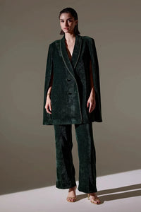 Featuring the Emerald Ensemble Set by ANAHE, this stunning two-piece set includes a luxurious corduroy long cape paired with sleek flare pants. Perfectly blending bold fashion with comfort, it offers a chic and sophisticated look for any occasion.