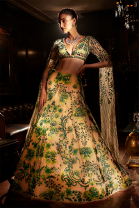 Embodying the enchantment of precious gems, this couture masterpiece from the 'JADE An essence' collection drives heartfelt emotions into the floral design of each kali. An alluring blouse, handcrafted with pearls, sequins, and Swarovski crystals elegantly harmonizes with extended trail sleeves.