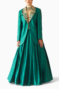 Featuring an emerald green hand embroidered oversized blazer with lehenga along with the chanderi bustier.