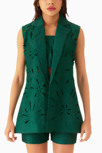 Crafted from chanderi fabric in a rich emerald green hue, this jacket features cut-work blooms embroidery on full jacket along the hem, adding a touch of femininity and charm. The silhouette offers a flattering fit, while the vibrant color makes a bold statement. Perfect for adding a pop of color to any ensemble, whether paired with jeans for a casual look or layered over a dress for a formal event, this jacket is sure to turn heads with its timeless elegance. Pair it with Betrue Emerald green shorts or trousers for a sophisticated complete look.