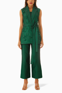 Crafted from chanderi fabric in a rich emerald green hue, this jacket features cut-work blooms embroidery on full jacket along the hem, adding a touch of femininity and charm. Pair it with trousers for a sophisticated complete look. Crafted from luxurious Chanderi fabric in a stunning emerald green hue, these pants exude elegance and charm. The straight-leg silhouette offers a flattering fit that elongates the legs, while the lightweight fabric ensures comfort all day long. These coords are a timeless addition to any wardrobe, perfect for elevating your style with a touch of luxury.ÂÂÂ
