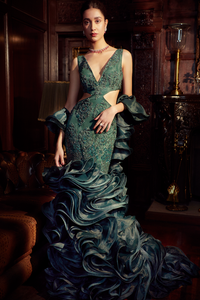 Embodying the enchantment of precious gems, this couture masterpiece from the 'JADE An essence' collection drives heartfelt emotions into the floral design of the gown. Handcrafted with pearls, sequins, and Swarovski crystals, the gown elegantly harmonizes with the artistic trail curated with an organza ruffle. This ensemble is accompanied by an organza-ruffled dupatta.