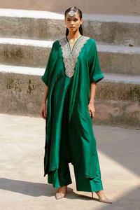 Featuring an Emerald green embroidered V-neck kaftan paired with palazzo pants, tailored in Chinese Dupion.