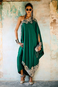 This stunning Off Shoulder Set in emerald green features an intricately embroidered off-shoulder cape, beautifully embellished with Zardozi work. The set is paired with a stylish wrap skirt, all crafted from luxurious silk, offering a perfect blend of elegance and contemporary charm.