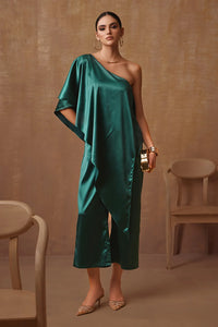 Featuring Emerald Green One Shoulder Jumpsuit by Bohochic's Lumiere Collection. Crafted in 100% satin silk, this emerald green jumpsuit features a graceful one-shoulder neckline with a front drape, creating a sleek, fluid, and effortlessly elegant silhouette.