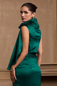 This emerald green silk satin draped top is a luxurious and elegant piece, featuring a beautifully flowing silhouette that enhances the natural grace of the fabric. The 3D floral detailing adds texture and a contemporary twist, creating a striking visual effect. The rich emerald green hue adds depth and sophistication, making this top perfect for formal events, evening gatherings, or festive occasions.