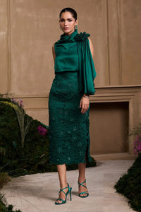 This stunning emerald green silk satin ensemble pairs a draped top with a tonal embroidered quilted skirt, creating a harmonious blend of elegance and modern design. The draped top features delicate 3D floral detailing, adding texture and a sophisticated, contemporary twist. The matching skirt, with its rich emerald hue and tonal embroidered quilting, adds depth and luxury, creating a flattering silhouette.