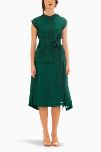 A stunning embodiment of elegance and allure. Crafted from luxurious silk in a captivating emerald green hue, this top with a belt exudes sophistication and grace. Paired with a skirt, crafted from luxurious fabric in a mesmerizing emerald green hue. Its flowing silhouette and delicate detailing create a sense of ethereal beauty, perfect for both formal events and romantic evenings.ÂÂÂ
