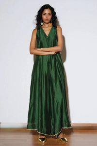 Featuring the Emerald Jumpsuit, a dark green V-neck design crafted from Chanderi silk. It has flared bottoms, a sleeveless cut, and delicate gota detailing at the hemline. Fully lined and handcrafted in India, this jumpsuit includes side seam pockets and a front zipper for easy wear.