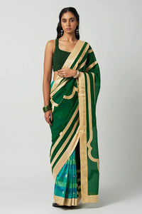 A signature Ohfab creation, this half-and-half saree combines the richness of handwoven pachranga silk with the delicacy of organza. The silk drape is adorned with intricate woven bootis – a hallmark of Ohfab’s craftsmanship – while the organza pallu features fine tissue applique in the shape of Mughal arches. This unique fusion of color, texture, and architecture makes the saree a statement piece for weddings, festive occasions, and luxury celebrations. Please note: all pieces are made by hand, celebrating handwoven fabrics and hand embroideries, hence there might be some irregularities from piece to piece.