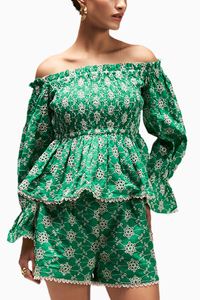 Features Emerald Off-Shoulder Co-ord Set by Boho Chic from Love Cabo Collection. Beautifully crafted in Cotton, this off-shoulder broderie matching set, smoked yoke, and detailed with delicate lace.