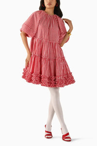 A playful red gingham dress with a relaxed silhouette and delicate ruffle details. The gathered neckline and flared sleeves add a touch of charm. Finished with a tiered hemline for extra volume and movement. Perfect for casual outings or statement styling.