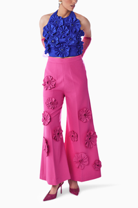 Featuring the Emma Floral Co-Ord Set, a symbol of contemporary elegance. Adorned with 3D floral embellished patches, these ultra-wide pants boast a side zipper opening for convenience. Complete the look by pairing with our Bora Bora Floral Top. Crafted from soft crepe in a delightful blue/pink color combination, offering a taper fit for a flattering silhouette. The contrast between the colors creates a visually appealing, super stylish ensemble.
