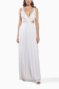 Introducing a captivating white gown adorned with ruched detailing, a criss-cross waistband, and a deep V-neckline. This elegant ensemble combines timeless sophistication with a touch of allure, creating a stunning silhouette that is both flattering and mesmerizing.