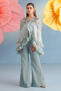 In a serene powder blue, the Emma Coord Set is a graceful three-piece ensemble featuring a flared cape, tailored pants, and a sleek inner. Crafted from pure silk organza and imported crepe, the cape is detailed with soft flare accents at the hem, adding movement and lightness. Embellished with sequins and hand-crafted 3D roses, it brings together subtle drama and refined femininity — making it ideal for intimate celebrations and statement occasions.