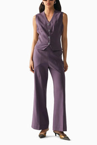 A sophisticated Co-ord set featuring a fitted vest and wide leg trouser, blending classic tailoring with contemporary minimalism. The set offers a powerful yet refined aesthetic, perfect for both workwear and evening styling