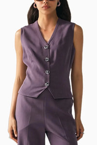 A structured vest with a tailored fit, featuring statement buttons for a refined look. Its sharp silhouette and versatile design to make it perfect to wear indivisually or as a layering piece.