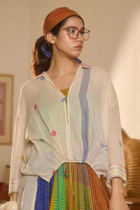 The Emmy Shirt is crafted from handwoven Jamdani fabric, featuring patchwork, hand-beading, and drawstring details. It comes with a handwoven yarn-dyed silk/cotton slip, offering a blend of elegance, comfort, and unique craftsmanship.