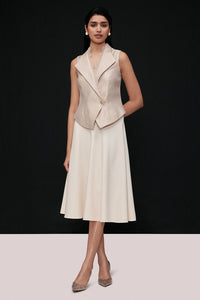 This elevated set pairs a tailored waistcoat with a sweeping retro-inspired midi skirt for a refined, feminine silhouette. The waistcoat features a structured lapel collar, crossover V-neckline, and delicate Chantilly lace framing the neck, finished with a fully lined and double-breasted buttons for a sharp, polished look. It is perfectly balanced by the voluminous A-line midi skirt, designed with a graceful flare, a discreet side pocket, and a concealed side-zip fastening. Together, the ensemble blends modern tailoring with timeless elegance.