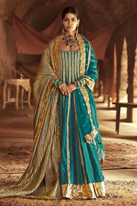 Featuring the Emerald Green with Gold Malala Kalidaar Set A by ITRH's Tirth collection. This exquisite set includes a silk chanderi anarkali with lampi and khadi strips, edged with broad itrh lampi and crystal droplets. Paired with a silk organza dupatta highlighted with cutdana and a second dupatta adorned with crystal droplets and lampi.