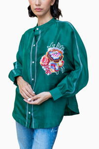 Featuring Emrald Vision Shirt by URAIB. Luxuriously crafted from silk, this shirt exudes opulence in the mesmerizing Emrald color, offering a sophisticated and statement-making addition to your wardrobe.