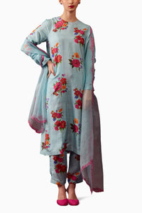 The Enchanted Bloom Ice Blue Kurta Set is crafted from the finest handwoven mulberry silk, offering an exquisite blend of comfort and elegance. The kurta features a captivating floral motif print, which brings a touch of nature's beauty to the icy blue hue.
