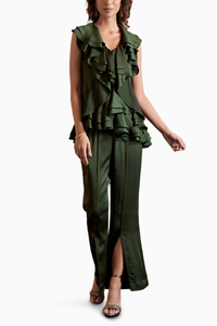 A little texture brings a whole lot of style to this wear-with-anything top in glittery fabric with ruffle detailing in front. Flared pant with front cut. Pair it up with your favourite heels and you're ready to slay.