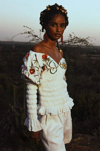 Several elements come together to make the wholesome Eniola Top; a sweetheart neckline, and full emroidered sleeves with smocking detail. Wear this embellished top on a brunch date or while hanging out with friends.