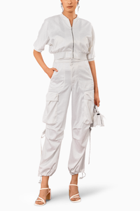 Featuring the Enrica Co-ord Set by The House of Exotique. Radiate elegance and glamour with this jacket and pant set, The Jacket has a rib collar, Zipper fastening with rib hem, and Elbow sleeves. Paired with pants, they are cargo pants, that have chunky pockets, zipper fly fastening, elastic drawing at the hem. Perfect for making a dazzling entrance on any special occasion.