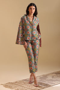 The Multicolor Eraya Cutworked Blazer is a bold statement piece, featuring intricate cutwork details that elevate its design. With long sleeves and a tailored fit, it exudes sophistication and modern style. Paired with matching pants in luxurious Malaysian Silk, this ensemble offers a seamless blend of elegance and comfort.