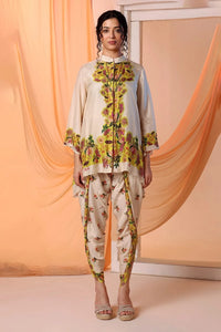 This elegant beige Aarani embellished shirt kurta features delicate embellishments that add a touch of glamour and sophistication to its classic design. The kurta is designed with flared sleeves, enhancing its graceful and flowing silhouette. It is paired with dhoti pants in a luxurious cotton-silk blend, offering both comfort and refined style. The combination of the embellished kurta and the dhoti pants creates a perfect fusion of traditional charm and contemporary flair.