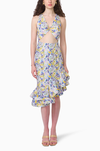 A statement dress featuring asymmetrical ruffles that mimic the movement of waves. Lined for comfort, featuring V-neck fit with a centre front cut-out and an invisible zip closure at the centre back. Pair it with strappy sandals for a daytime look, or dress it with delicate jewelry and heels for a chic night out look.