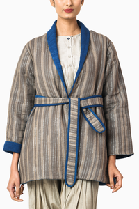Featuring the Espresso Quilted Jacket by Jayati Goenka. This brown coffee-colored cotton quilted jacket is hand block printed with natural dyes. Lined with natural indigo-dyed cotton linen, it feels soft on the skin. Detailed with our signature handwork of button and sashiko in golden thread, it comes with a quilted belt for effortless styling.