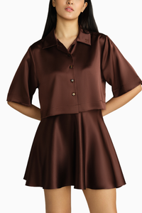 Featuring the Espresso Silk Cropped Bowling Shirt by Refined Revolution. This elegant piece is crafted from 100% silk charmeuse satin, featuring shell effect buttons and an A-line fit with back yoke gathers. Designed for a relaxed fit, true to size.