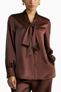 Long-sleeved tie-neck top in espresso, crafted in 100% silk charmeuse satin with shell effect buttons. Designed with a long neck tie to be fastened as desired and gathers at the cuff.