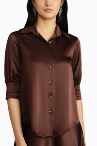 Featuring the Espresso Silk Short-Sleeved Shirt by Refined Revolution. Luxuriate in espresso-hued charm, crafted from 100% silk charmeuse satin. With oversized collar and cuffs, shell effect buttons, and pleats at the elbow-length sleeves. Designed for a relaxed, true-to-size fit.