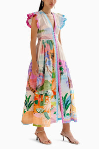 The Estella Maxi, a beloved bestseller, makes a stylish return as part of NOIB's Spring/Summer 25 collection with two stunning new variations. Crafted from premium Giza poplin, it is available in Seashell, featuring tiered detailing at the bottom, and By the Sea, showcasing a graceful placement print. Both designs are elevated by intricate pleating at the waist and braided button loops made from crochet thread, adding a touch of artisanal charm.