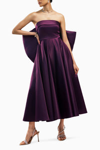 Featuring Esther Strapless Dress With A Bow by Brinda Sneha by their Love Locked Collection. It's a midi-length dress featuring a strapless bodice with a folded top that creates a sleek silhouette. The design is elevated by an oversized bow attached to the back, while the flared skirt adds volume and elegance to the look. It's the perfect choice for a bachelorette party, prom, or any evening event.