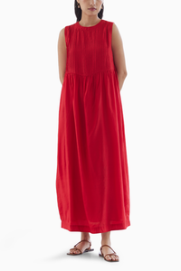 In a delicate shade of red, the Eternal Ties Pink Dress dress is handwoven with meticulous care using the finest silk modal. The exquisite pleat detailing on the front yoke adds a touch of sophistication, giving a sense of depth and dimension to this silk dress. Handmade tatted flower buttons adorn the back yoke, elevating the dress to a timeless classic.