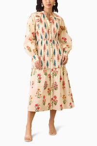 Embrace effortless elegance with our Ethereal Bloom Cotton Midi Dress. Crafted from soft, breathable cotton, this ivory-hued dress features a charming hand-block print of floral and paisley motifs in earthy tones. The front-button design, delicate ruffle detailing on the bodice, and gathered waistline add a touch of vintage femininity. Perfect for brunches, casual outings, or summer festivities, this dress blends comfort with timeless grace. Pair it with statement earrings and sandals for a breezy, chic look.