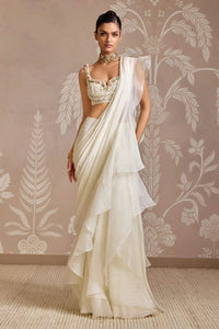 Featuring Ethereal Thread Sari Drape Set by Ridhi Mehra's In the Folds Summer Collection '25. This enchanting set includes a placement embroidered sleeveless raw silk blouse paired with a chiffon drape saree, adorned with delicate organza ruffles for a refined, graceful look. A perfect blend of elegance and sophistication.